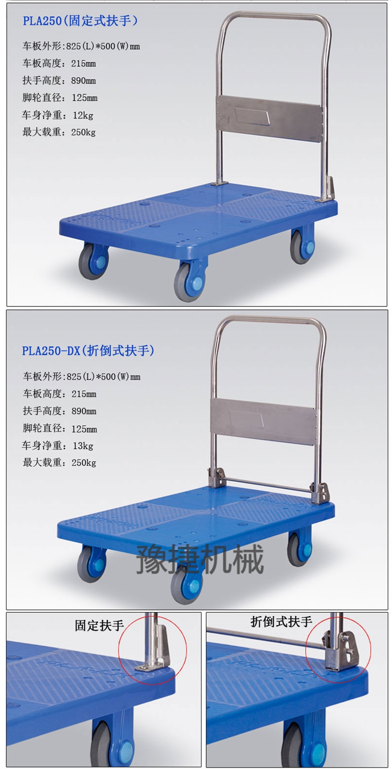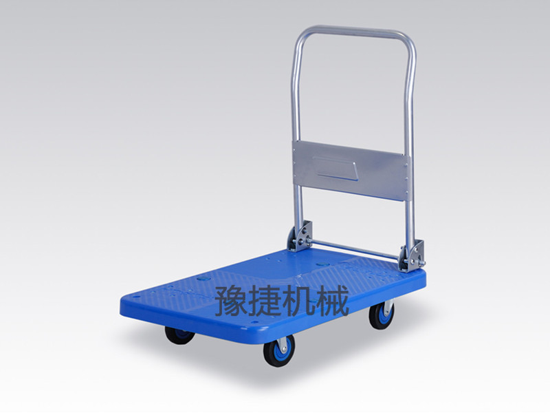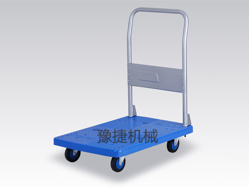 【ky平台-ky平台(中国)】平板手推车由塑料车板、粉体涂装扶手(可折倒、固定)、静脚轮(尼龙支架、铁板支架)等组成。