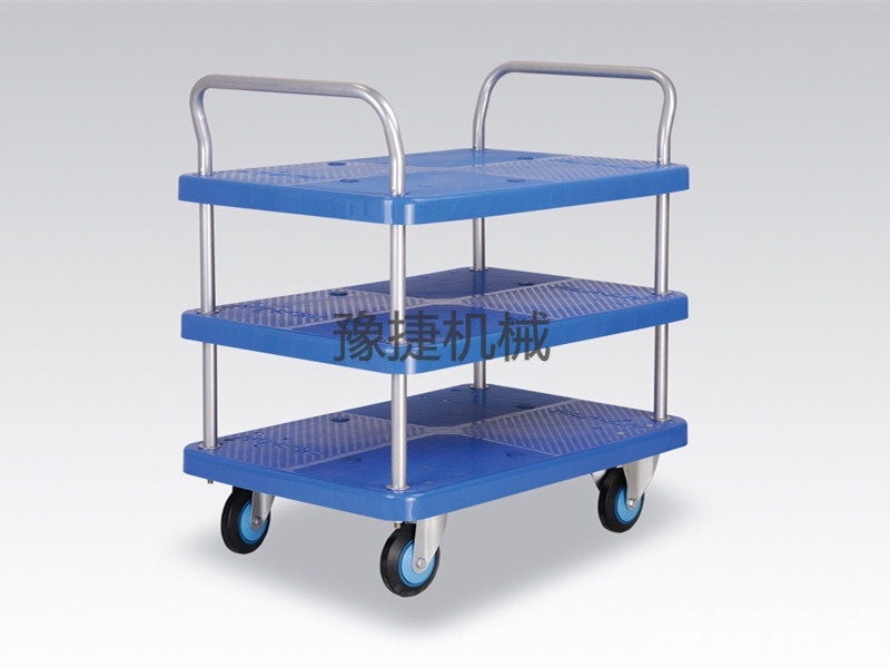 【ky平台-ky平台(中国)】平板手推车由塑料车板、粉体涂装扶手(可折倒、固定)、特静脚轮(尼龙支架、铁板支架)等组成。