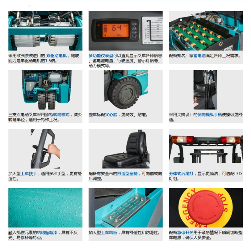 1、交流控制器匹配交流控制电机及交流起升电机,全交流叉车--动力更强劲,操控性佳,稳定性好。